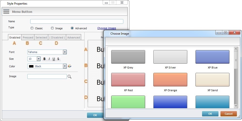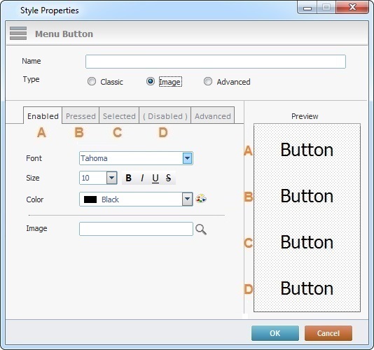 a. Edit the font settings of each Menu Button state's text (“A- Enabled”; “B-Pressed”; “C-Selected” and “D-Disabled”) by clicking each tab: