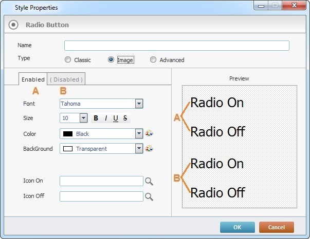 c. Edit the text of each “Radio Button” state (“A- Enabled” and “B-Disabled”) by clicking each tab: