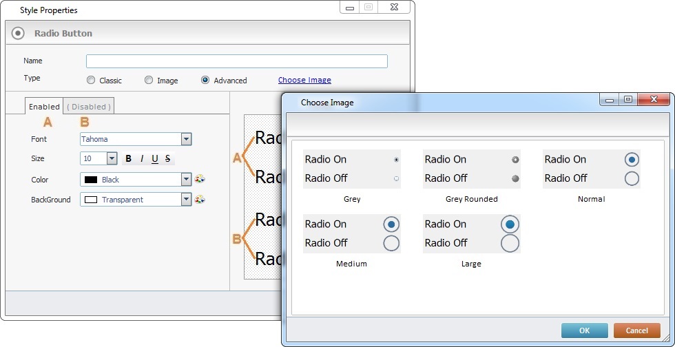 The following presents the options available (A, B or C) to create/edit a Radio Button control.
