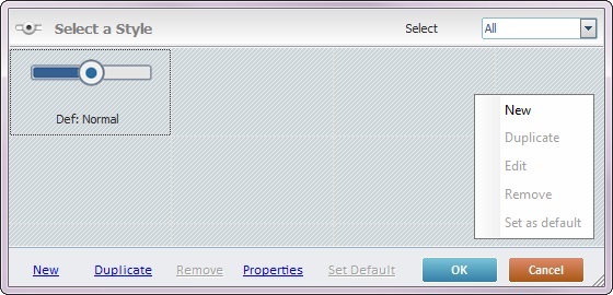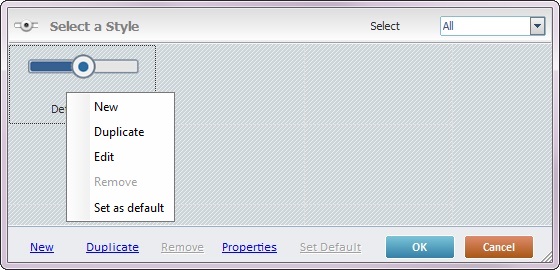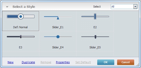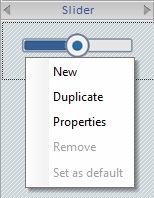 Sets the selected style as the default style ("Def:" is added to the style's designation). Once set, the default style will be adopted by all Slider controls dragged from the “Control” tab onto the screen. |