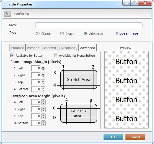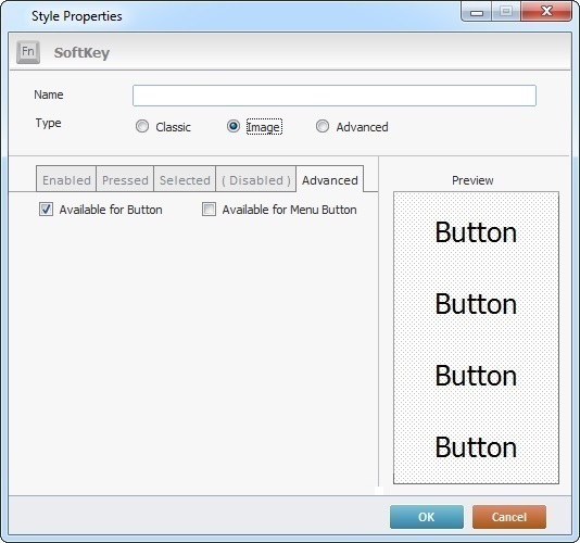 c. The "Advanced" tab allows you to decide if the new style will be available to the Button control and/or the Menu Button control. Check "Available for Button" or "Available for Menu Button" or both.