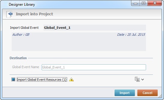 If the global event contains resources, check this option to ensure they are included in the import. Their destination is the target project's "Resources" module. |