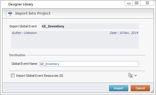 If the global event being imported is "locked" (Export option that turned the selected element into a non-editable element - see To Export a Global Event), you will not be able to edit its name. The option "Global Event Name" will be inactive (displayed in gray).