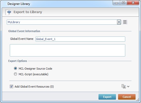 b. Drag the global event you want to export and drop it on the Library Manager's window. This opens the corresponding "Export to Library" window.