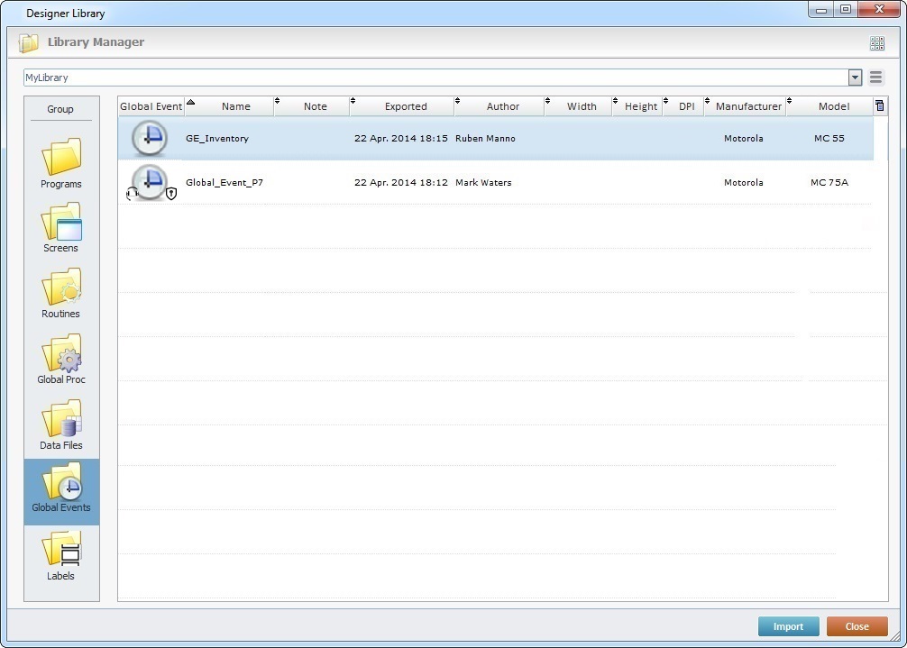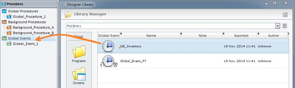 Global Events that have been developed within MCL-Designer are reusable. With the use of the Library (a folder that stores reusable elements such as data files, programs, screens, etc.) and the "export"/"import" procedures, global events created in a specific MCL-Designer project can be exported (into Library) and, later on, be imported into another project or projects (from Library).