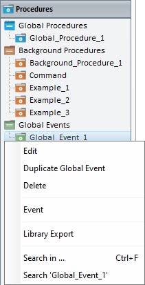 The newly imported global event is displayed in the "Procedures" module and available to the current project.