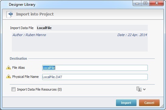 Data files do NOT contain resources. However, if you have previously exported a data file into Library with project resources, when you import that data file into a new project, you have the choice to append those project resources to the data file import. Check this option to append all the listed resources to the selected data file's import. |