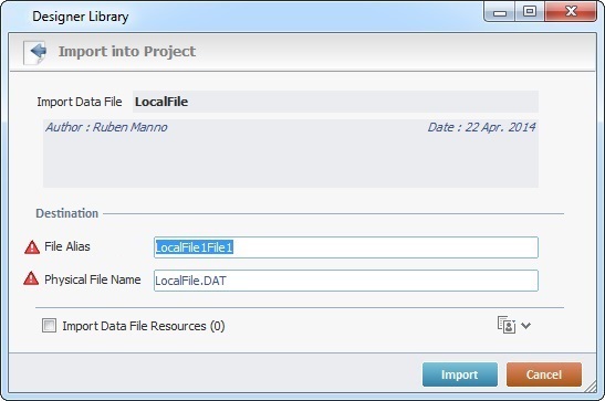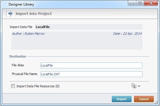 It is possible to append project resources (appended during the data file's export into the "Library" - see To Export a Data File to Library) to the data file's import, even though they are not included in the data file.