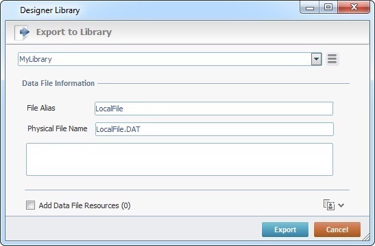 b. Drag the data file you want to export and drop it on the Library Manager's window. This opens the corresponding "Export to Library" window.