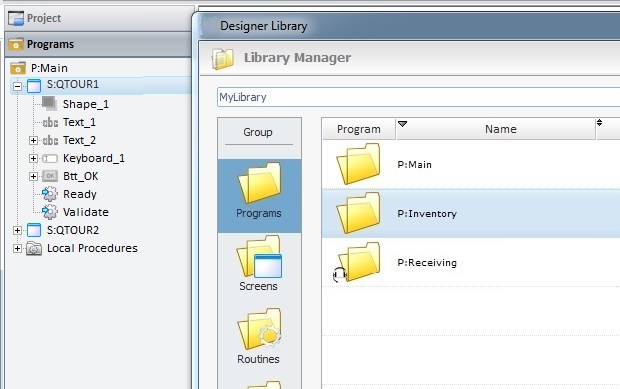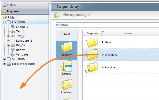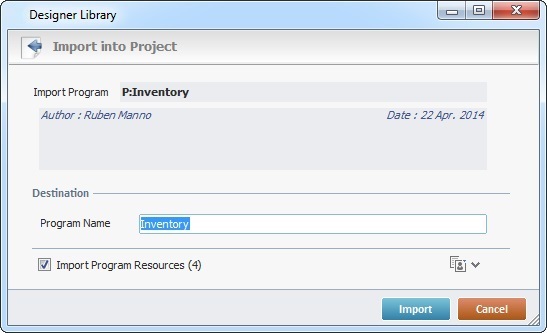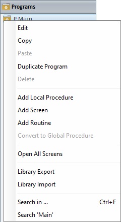 To do so, you must, first, export the intended program(s) from the current project into Library (a shared folder that stores exportable elements such as data files, programs, global procedures, screens, etc.) and, second, import the required program(s) from Library into other MCL-Designer projects.