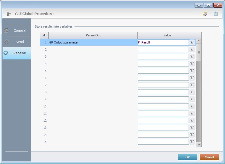 Once you define the global procedure you want called in the properties window of a "Call Global Proc" process (in the "General" tab), its "Send" and "Receive" tabs are automatically filled in with the "in/out parameters" you defined for the global procedure in its own properties window.