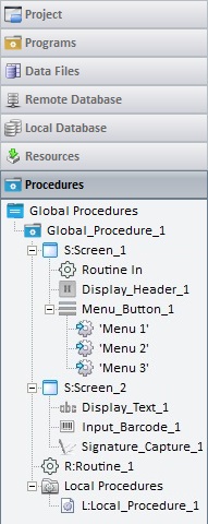 This illustration displays the structure of a global procedure as is displayed in the tree view. It contains screens, routines, controls and a local procedure. |