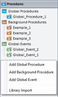 1. To add a global procedure to a project, open the “Procedures” module, right-click an empty area or "Global Procedures" (the name of the section that displays the existing global procedures) and select the “Add Global Procedure” option.