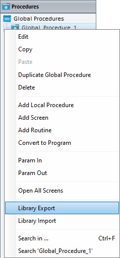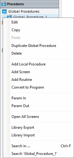 Some of the right-click menu options are not applicable if the global procedure in question is a previously imported global procedure that is "locked" (an Export option - see To Export a Global Procedure to Library below). A "locked" global procedure is not editable so, certain operations (related to a global procedure's duplication, the adding or importing of screens/local procedures/routines or opening all the included screens) are NOT executable.
