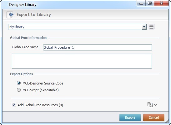 b. Drag the global procedure you want to export and drop it on the Library Manager's window. This opens the corresponding "Export to Library" window.