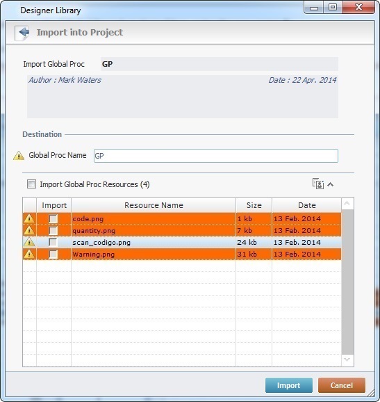 The •The current project contains a global procedure with the same name as the one to be imported. •The destination project contains resources with the same name as the ones being imported.