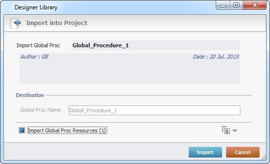 If the global procedure contains resources, check this option to ensure they are included in the import. Their destination is the target project's "Resources" module. |