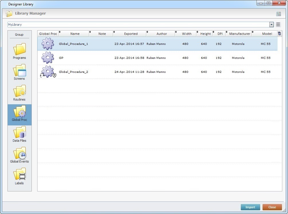 It is possible to reuse global procedures via an export/import. The global procedure is exported into Library (a shared folder that stores exportable elements such as data files, programs, global procedures, screens, etc.) - see To Export a Global Procedure to Library. Afterward, it becomes available for future import into another MCL-Designer V4 project that requires its use (see To Import a Global Procedure from Library).