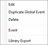 Some of the right-click menu options are not applicable if the global event in question is a previously imported global event that is "locked" (an Export option - see To Export a Global Event to Library). A "locked" global event is not editable so certain operations (related to a global event's duplication, export or settings/content edition) are NOT executable.