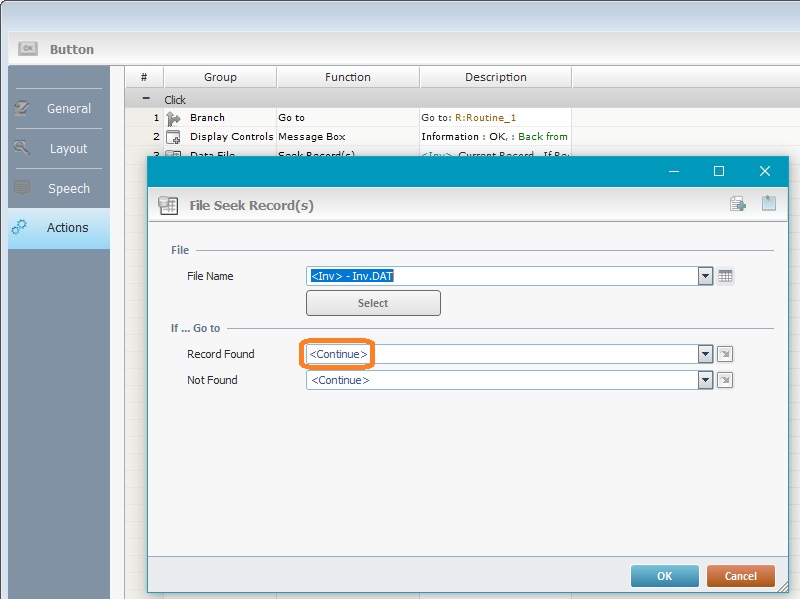 1. In the properties window of the intended process, go to the field that should refer the label you want to create. Ex: In the "File Seek Record (s)" process, focus on the "Record Found" field).