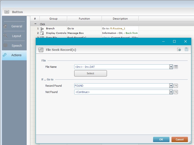Processes can be associated to actions (events performed by the operator) which exist within controls and screens. In other words, they are a consequence of an action (ex: When an operator clicks on a button (event), it triggers an action, such as going to another screen (a "Go To" Branch Process). Processes can, also, be assigned to local procedures, routines, global events, "routines in" or "routines out".