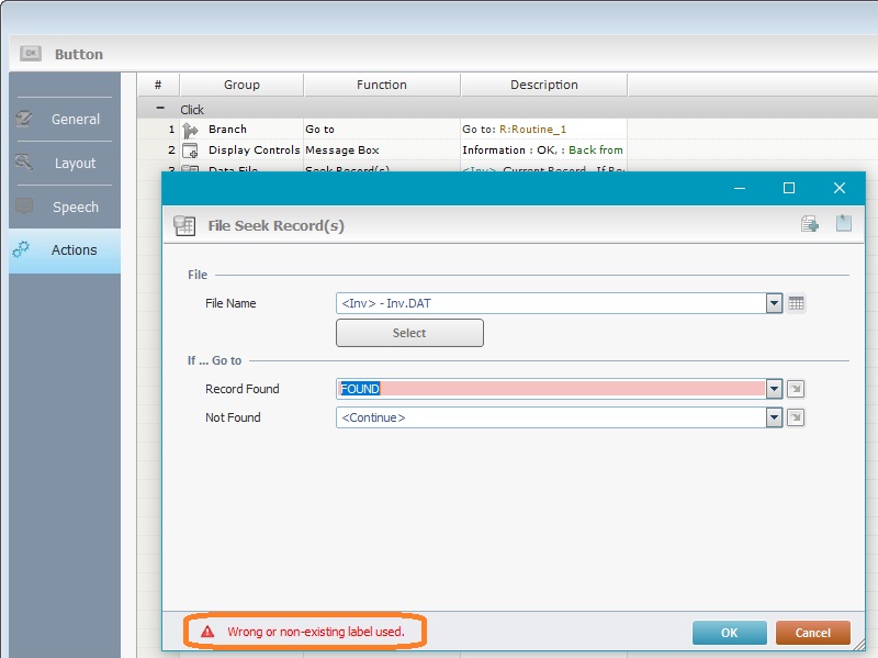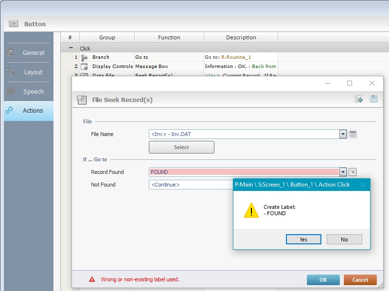 . The system detects that the referred label does not exist/has the wrong name and displays a warning message.
