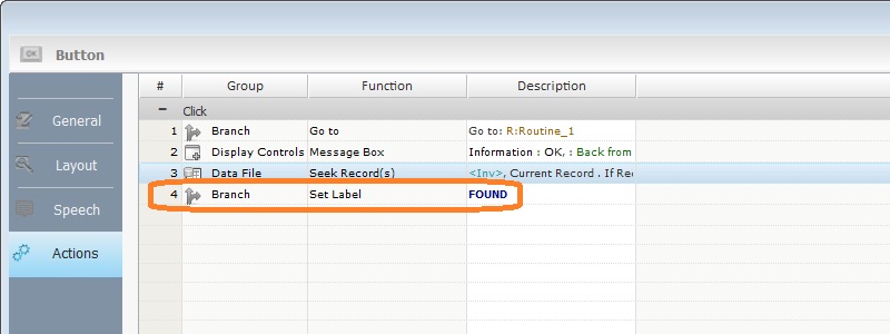 to confirm. The result is the creation of a new label in the same "Actions" tab (or "Routine" tab, "Procedure" tab or "Event" tab, depending on the context") that includes the process - it is represented by the "Set Label" process and is placed after the process it was created in.