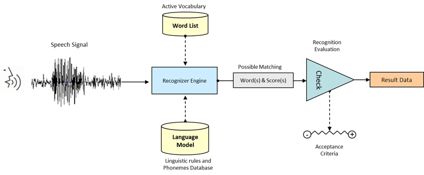 The recognizer engine (ASR) responsible for the speech input's comparison analysis relies on two sources: