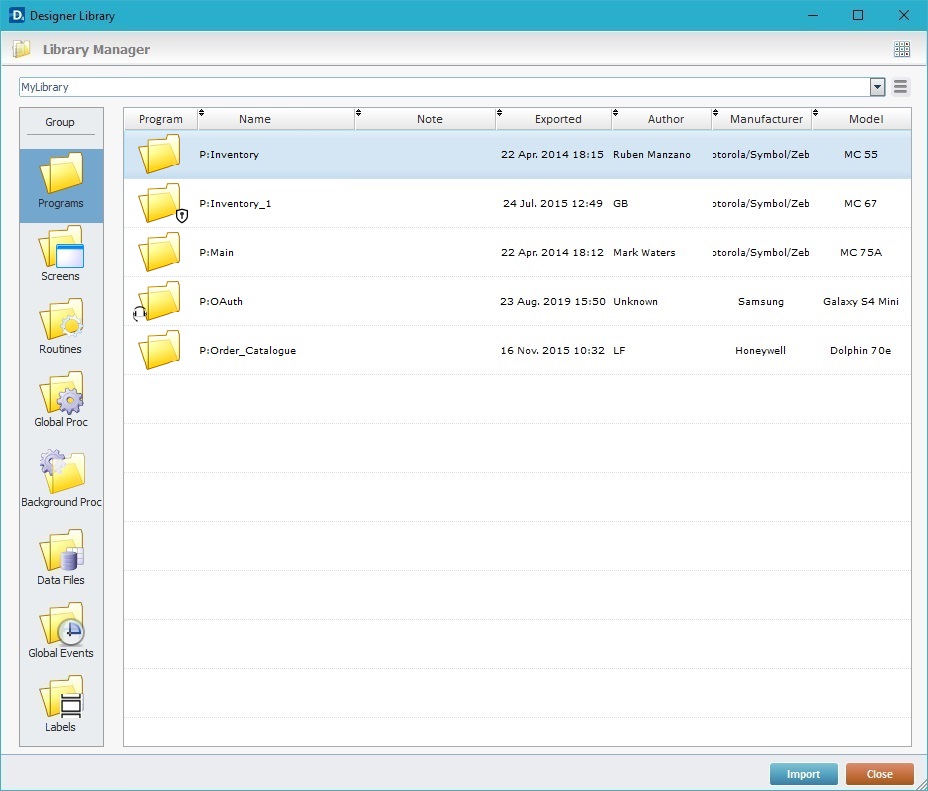 In MCL-Designer V4, the Library is the source folder for an import. Library contains elements (programs, screens, routines, global/background procedures, data files, global events and label profiles) that have previously been exported from other MCL-Designer projects into it. See Export to Library.