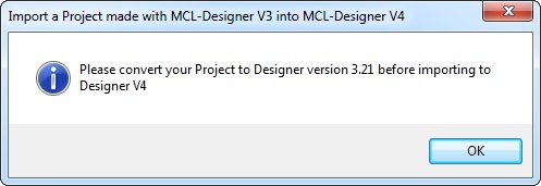 Only projects developed with the latest MCL-Designer V3 version (v3.21) can be converted and imported into MCL-Designer V4.