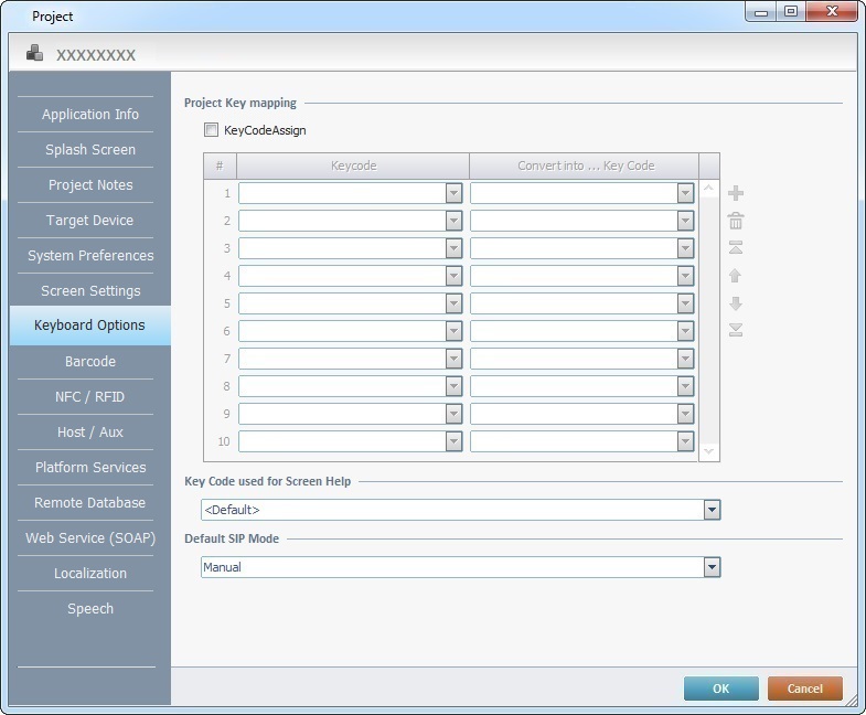 In the "Keyboard Options" tab, appoint specific functions to specific keyboard keys. To activate them, check the “KeyCodeAssign” option. Depending on the device type, key codes can be assigned to certain hardware keyboard keys.