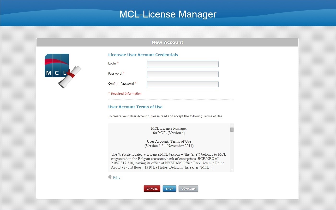 6. Read the "Terms of Use" regarding the new MCL-License Manager account (scroll down to access the text and activate the