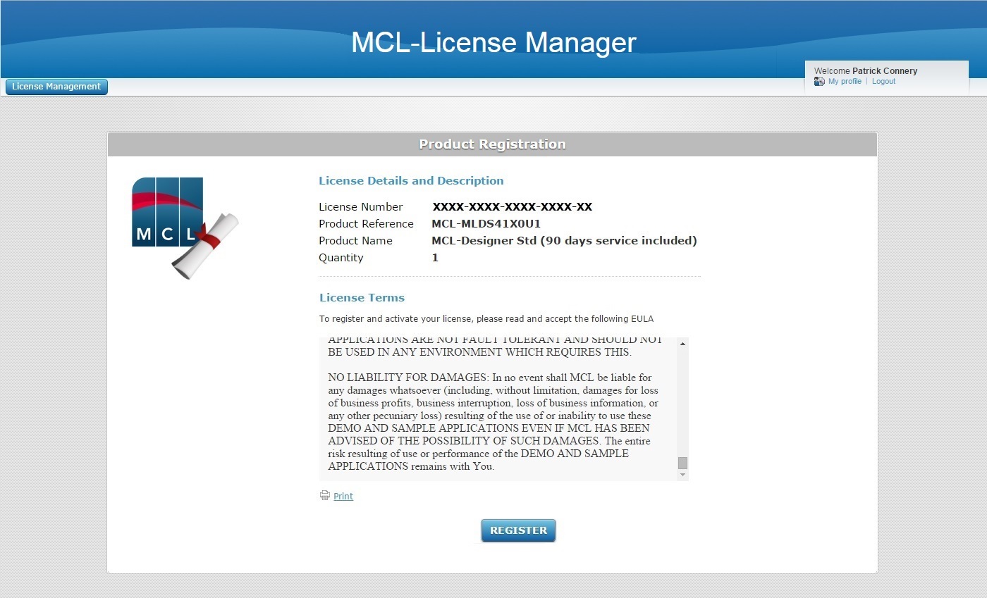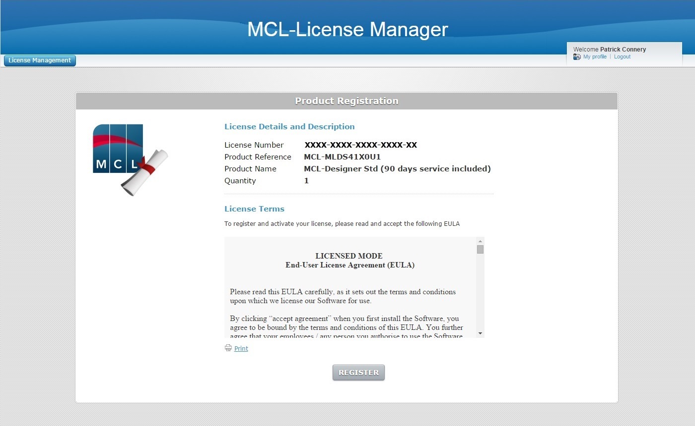 You will receive an email (sent to the email address you entered in contact information - "License Registration Notification") validating the recent registration. The email also provides license information (product name, product reference, license number) and a link (License Administration) to your MCL-License Manager account.