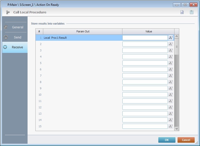 In ("Send" tab) /Out ("Receive" tab) Parameters of a "Call Local Proc" Process |