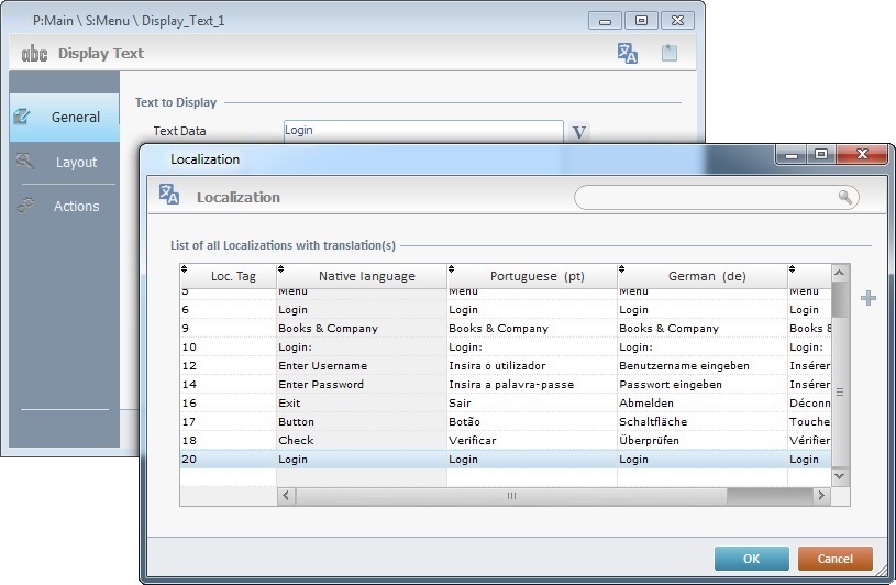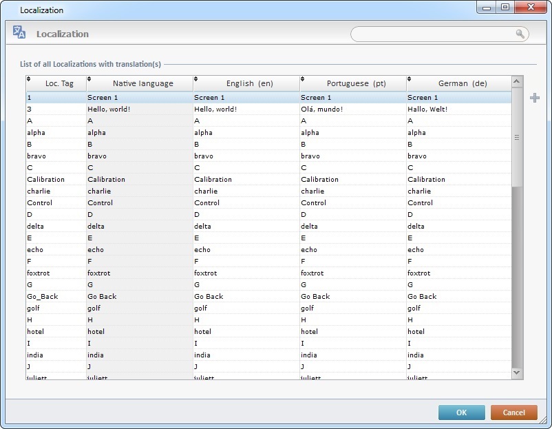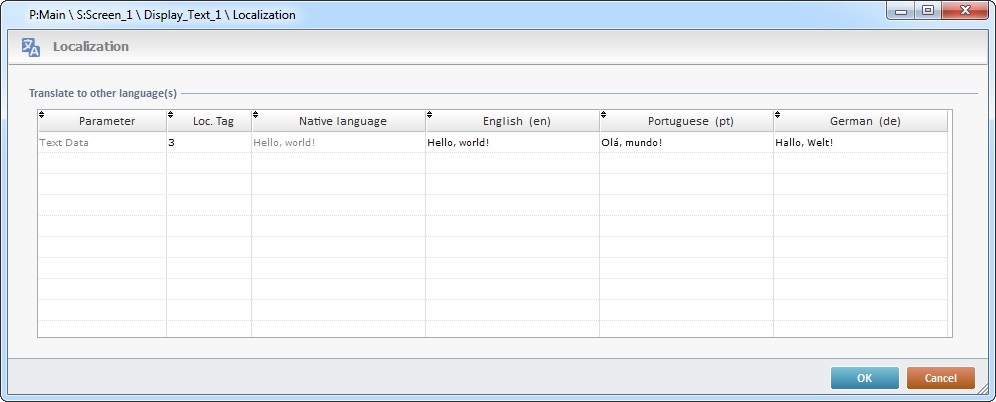 Ex: The “Display Text’s” localization tag is “Hello, world!” (in the native language). Since the project languages (defined in the “Localization” tab) are English, Portuguese and German, the translation for “Hello World!” was entered, by the programmer, in the corresponding columns. MCL-Designer V4 does NOT provide an automatic translation from the “native” language into the other project languages.