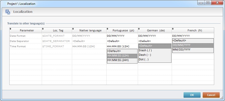 In addition, you can associate a specific date/time format to each project language. This is defined in the "Project Properties" window: