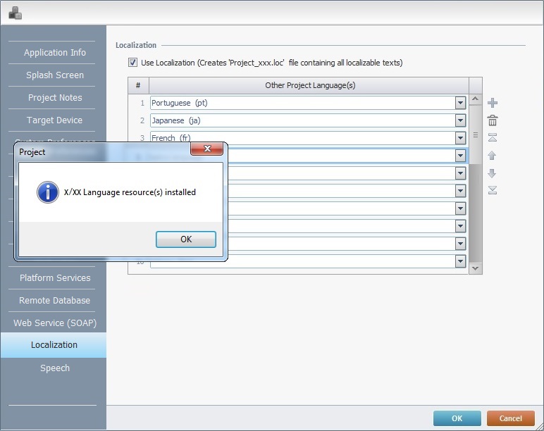 A new project language is added so a message warns you that the language package for the newly selected language(s) will be installed after the window is closed with the |