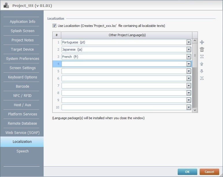Once a project language is defined, the corresponding language file is generated. By default, it will be filled in with a duplicate of the localization tags created in the “native” language. It is up to the programmer to provide the necessary translations for each localization tag. Each selected language has its own language file. When a project is generated, the language file becomes a resource of the resulting application (.loc file).