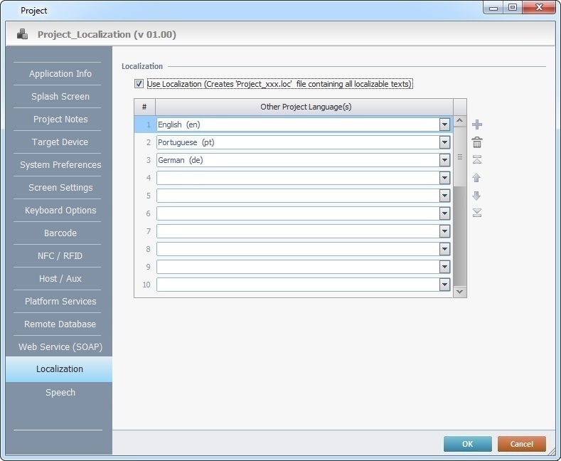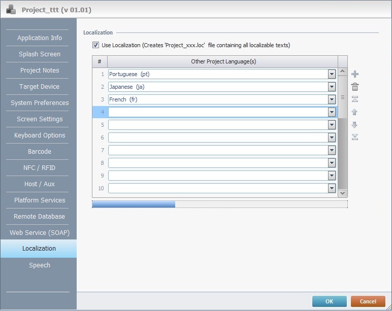 The "Localization" tab is used to define more project languages. In other words, if required, the project's native language (the one used by the programmer in the original project) can be translated into other languages.