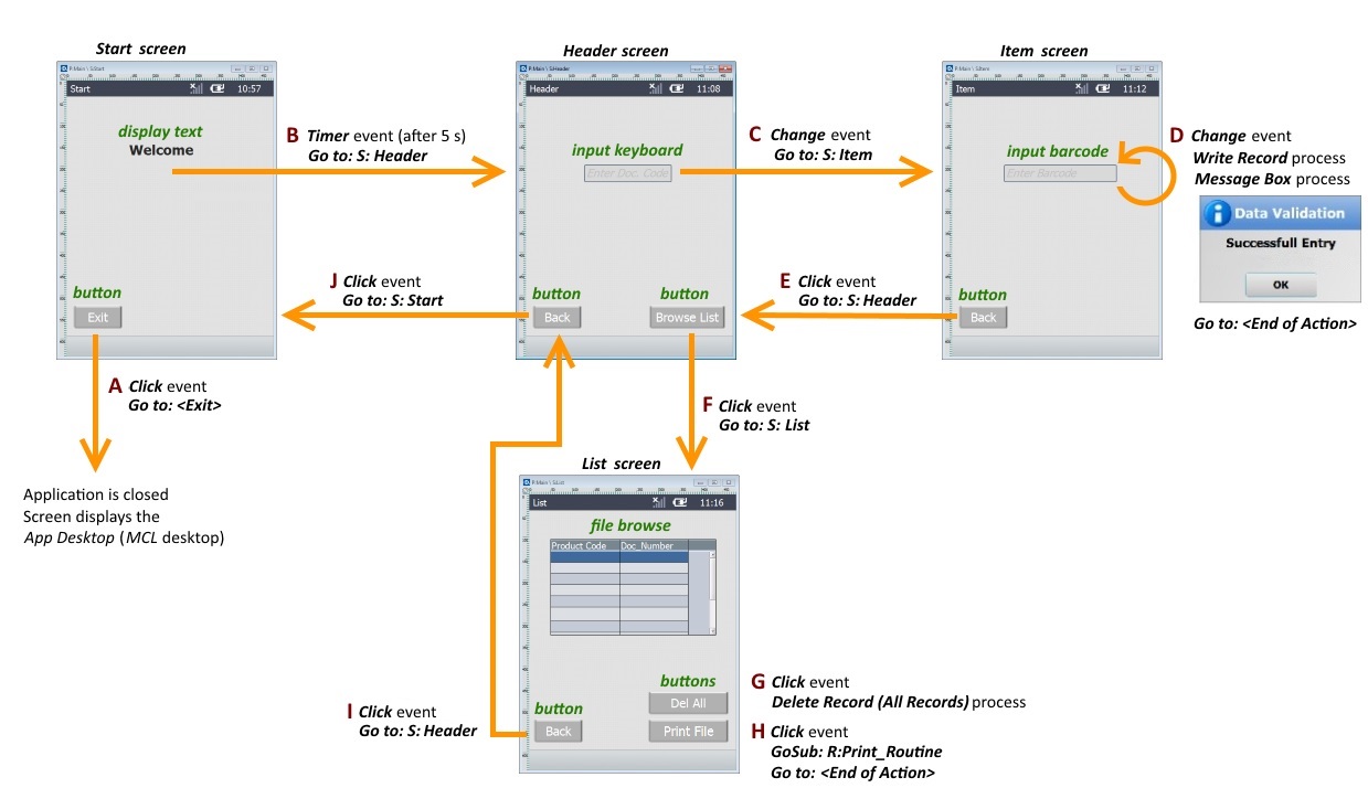 This data collection application also allows the operator to check the data being entered. Once the operator is redirected to the "List" screen, with the help of the “Browse List” Button, you can not only view the entered data (in the File Browse control) but you can also delete that data. In this case, the Button “Dell All” does not redirect the program’s workflow to another screen (there is no "Go to" process added to the “Click” action) but performs a delete operation (G).