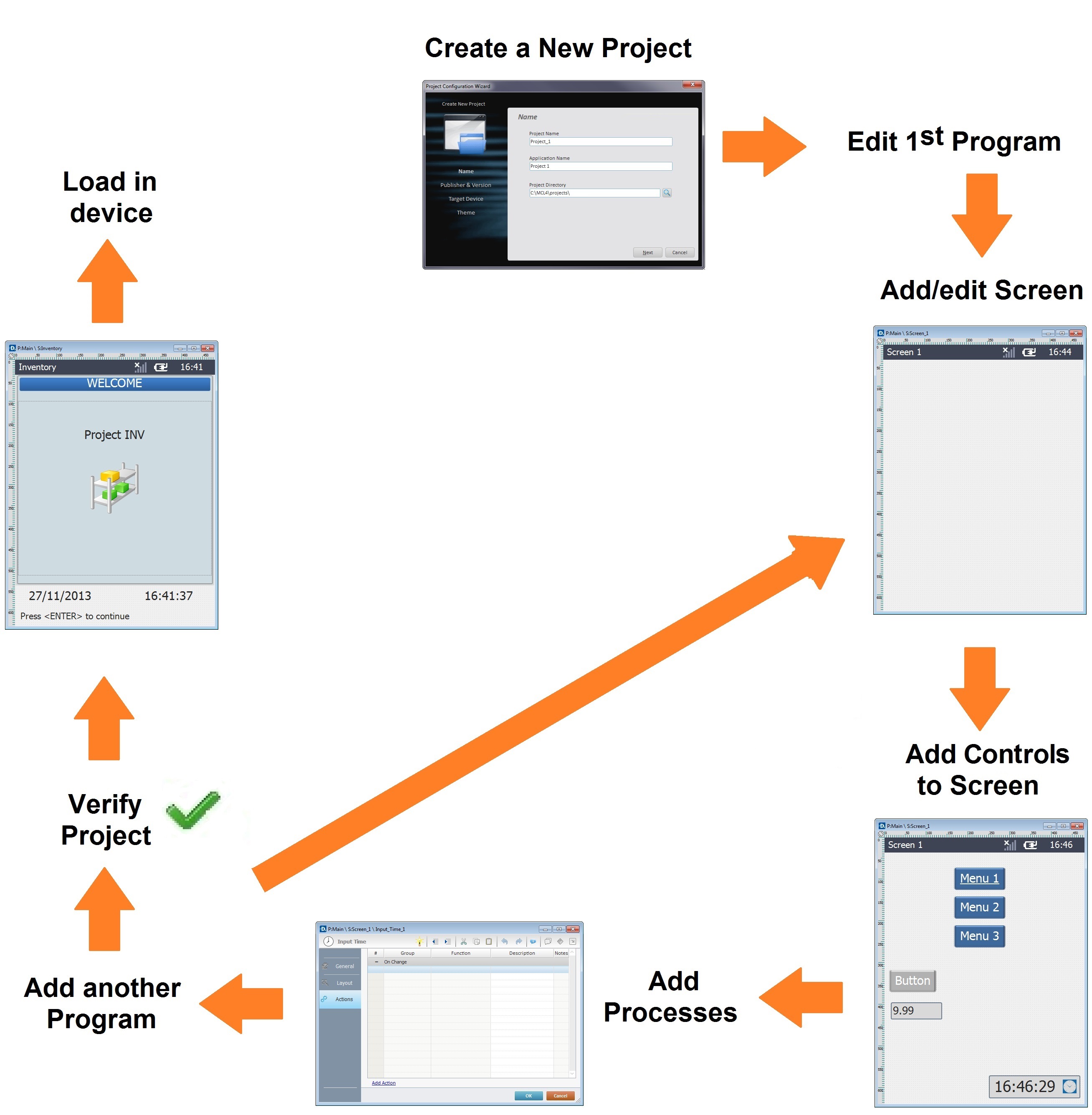The illustration below displays a typical development workflow within MCL-Designer V4, starting with new project creation, and ending with the sending of a completed project (that is to say, an application) to a device.