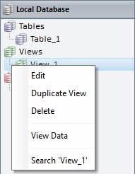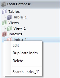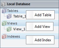 Right-click the required section to add a Table, a View and/or an Index. The new elements are displayed in a tree view below the corresponding section.