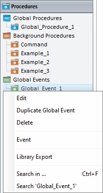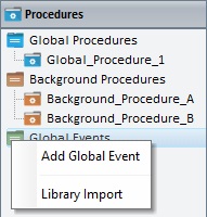 The "Procedures" module enables the viewing, adding, importing and/or exporting of global procedures, background procedures and global events.