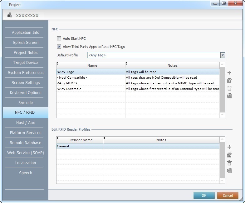 The only exception is the standard NFC profiles ("<Any Tag>"; "Ndef" Compatible"; "<Any MIME>" and "Any External>") - their settings are NOT editable.