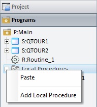 Adds a local procedure to the selected program. See Local Procedures. If the selected program is a previously imported program that is "locked" (not editable), this option is NOT applicable. |