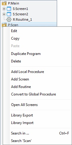 Some of the right-click menu options are not applicable if the program in question is a previously imported program that is "locked" (an Export option - see Exporting/Importing Programs). A "locked" program is not editable so, certain operations (related to a program's duplication, the adding of screens/local procedures/routines, opening all the included screens or import/export operations) are NOT executable.