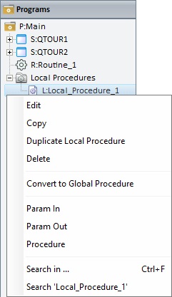 Right-clicking a Local Procedure, represented in the tree view, provides access to the following menu: