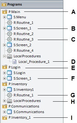 A program is comprised of screens which, in turn, encompass controls and processes. A program can also contain routines and local procedures.