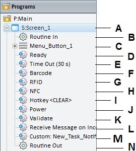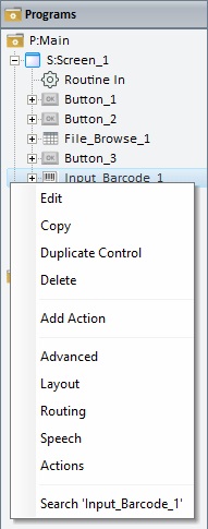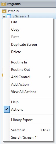 The tree view displayed in the "Programs" module includes the project's screens as well as the controls, actions, routine in/out contained in each screen. The tree view allows for the adding, editing, deleting and properties setting of the elements being displayed. Depending on the element you right-click, the resulting menu offers options related to the selected element: