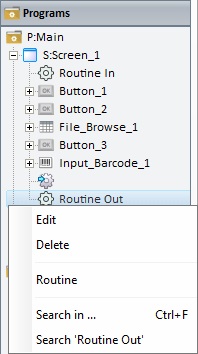 Right-clicking the "routine out" displayed in the tree view ("Programs" module) opens the following menu: